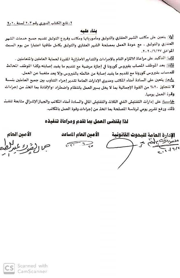 عودة العمل بمصلحة الشهر العقاري والتوثيق بكامل طاقتها اعتبارا من يوم السبت الموافق ٢٧ يونيه ٢٠٢٠