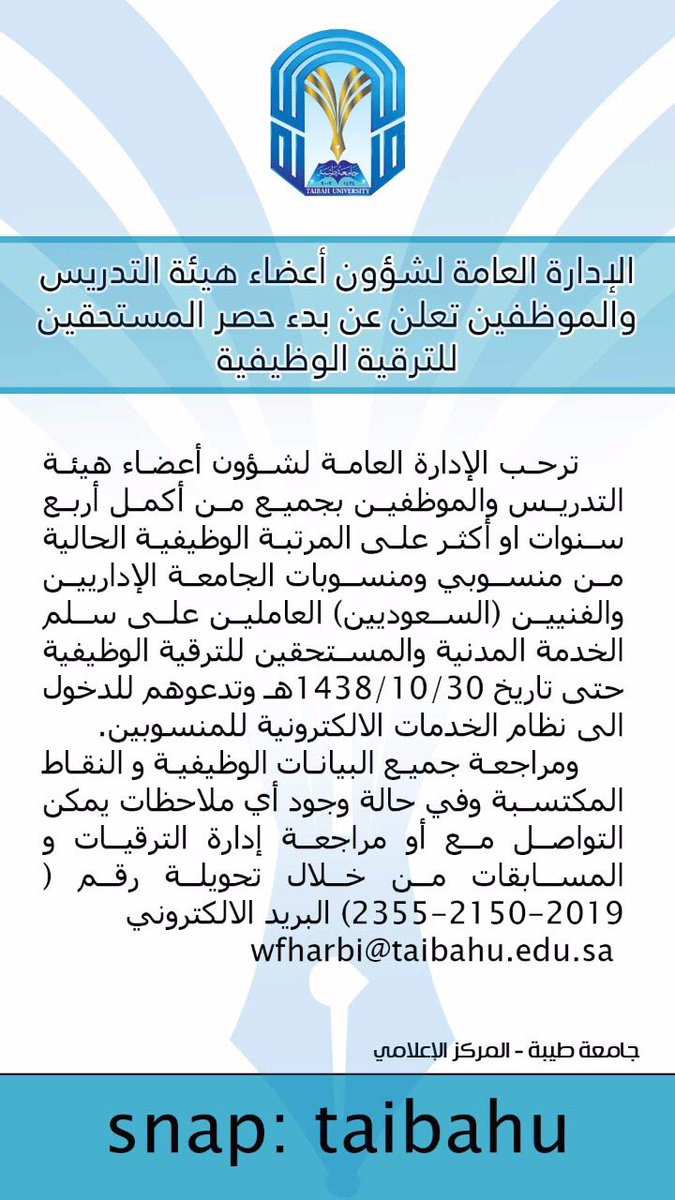 جامعة طيبة Taibah U Pa Twitter إعلان الإدارة العامة لشؤون أعضاء هيئة التدريس والموظفين بـ جامعة طيبة تعلن عن بدء حصر المستحقين للترقية الوظيفية Https T Co Uqjonv67qo Https T Co Vktbc76kka