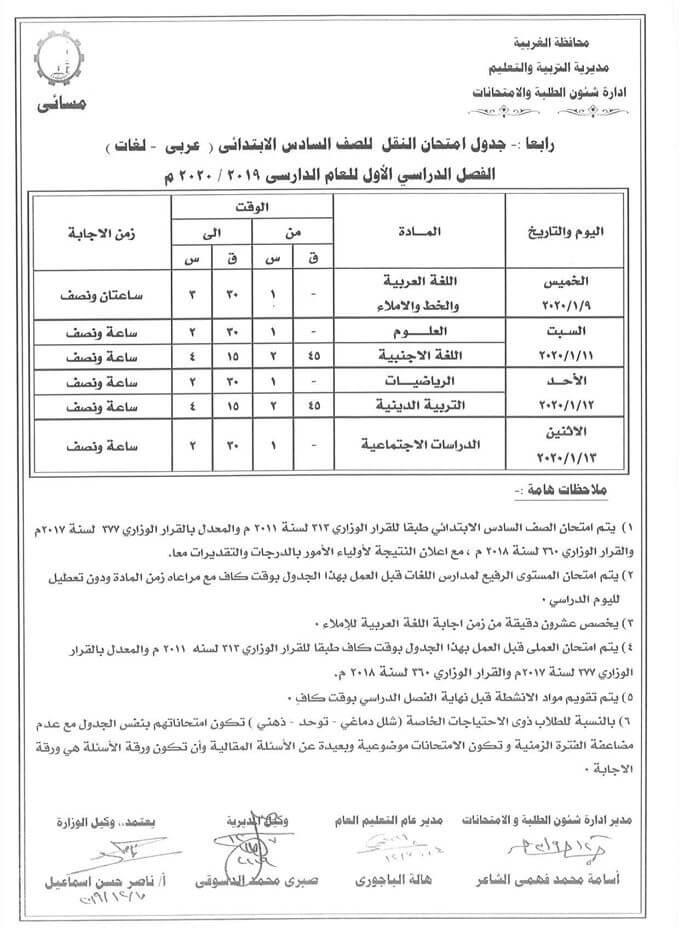 جدول امتحانات الصف السادس الابتدائي الترم الاول 2020