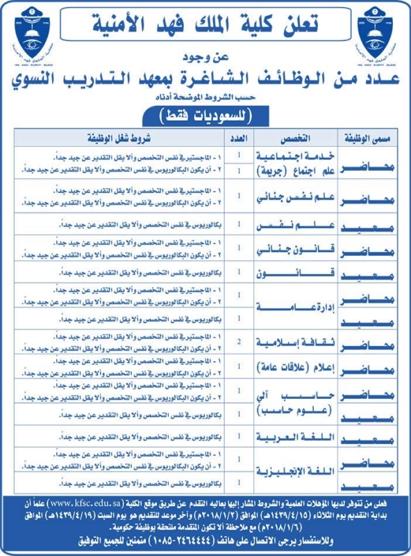 وظائف شاغرة محاضر ومعيد كلية الملك فهد الأمنية ملتقى السعودية وظائف السعوديه وظائف شاغرة فى السعوديه توظيف السعوديه تنقيب السعوديه