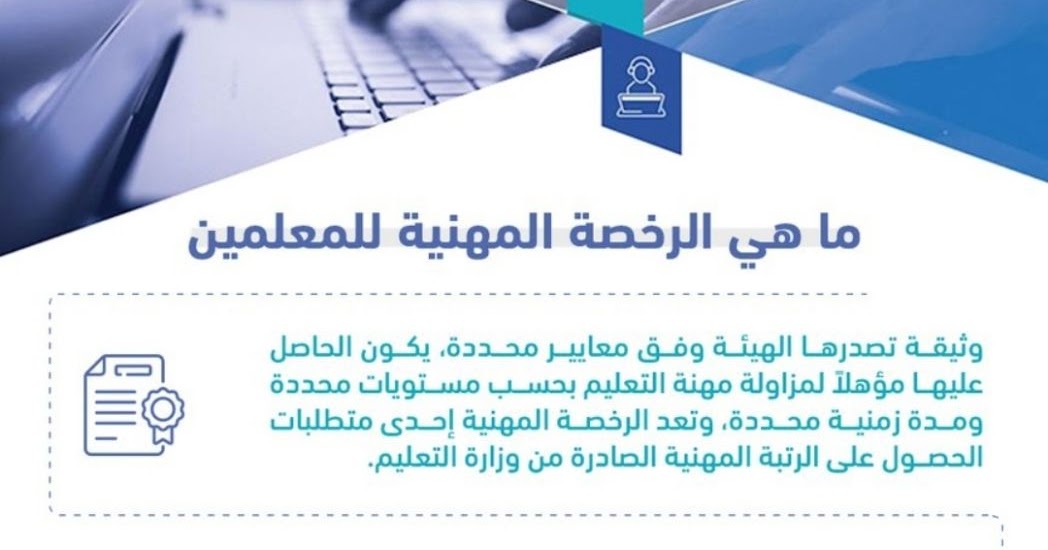 مصطلح الرخصة المهنية هي وثيقة تصدرها هيئة الت قويم في المملكة العربي ة الس عودي ة ليتمك ن المعل مون من مزاولة مهنتهم ضمن الس ل م الوظيفي المعتمد من قبل وزارة الخدمة المدني ة في المملكة ويتم الحصول على هذه الر خصة بعد. Advertisements كانت هذه تفاصيل خبر ما هو اختبار الرخصة المهنية بديل كفايات المعلمين لهذا اليوم نرجوا بأن نكون قد وفقنا بإعطائك التفاصيل والمعلومات الكامله ولمتابعة جميع أخبارنا يمكنك الإشتراك في نظام التنبيهات او في احد. ماهي الرخص المهنيه للمعلمين ماهي الرخصة المهنية للمعلم وتتلخص فكرة خطة الهيئة للترخيص المهني في تطبيق المعايير المهنية بصورة تدريجية بحيث تدعم وتمكن التعليم بأدوات الدعم خلال بناء هذه الأدوات.