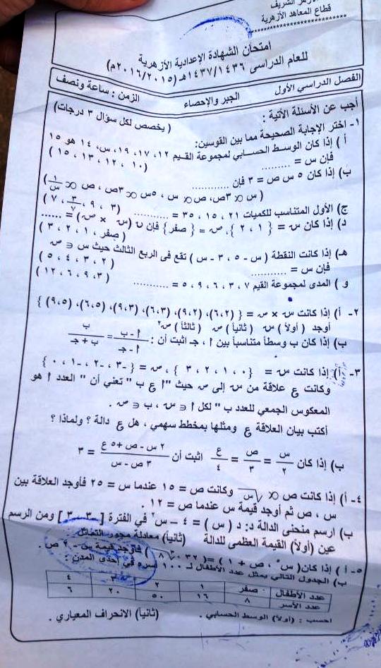 ورقة امتحان الجبر للازهر الصف الثالث الاعدادى الترم الاول 2016