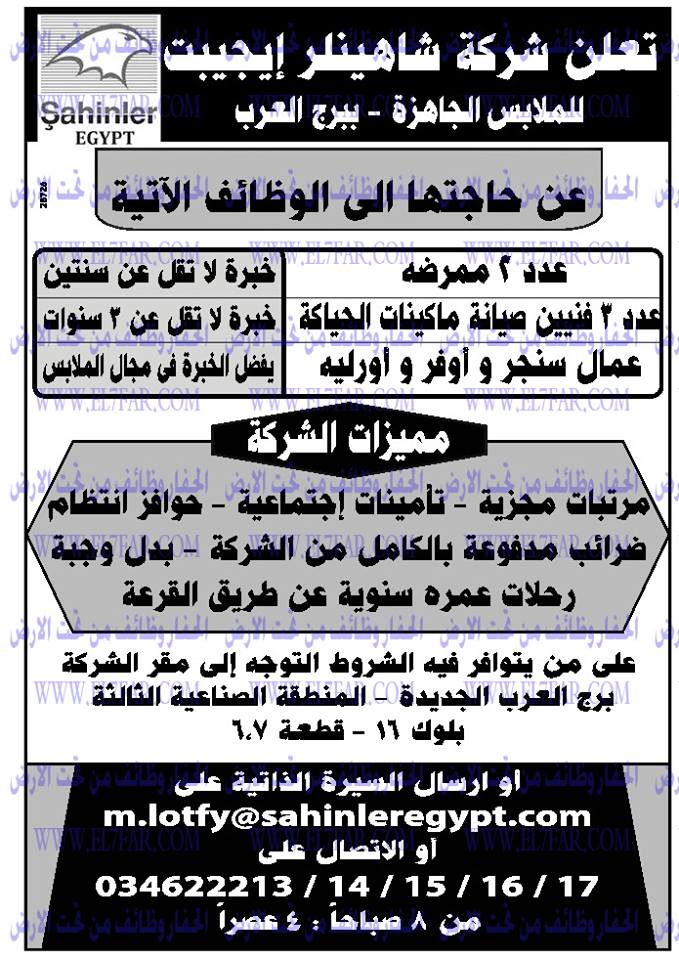 تعلن شركة شاهينلر ايجيبت للملابس الجا سكربت توظيف وظائف