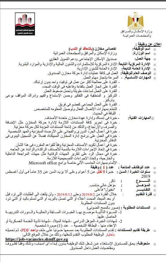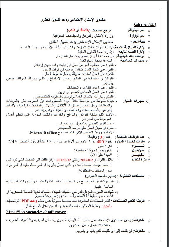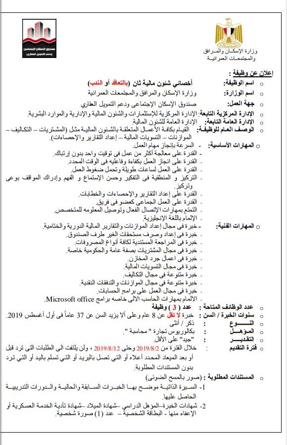 وزارة الأسكان تعلن عن فتح باب التقديم للوظائف الخاليه بصندوق التمويل العقارى والاسكان والتقديم حتى 18 8 2019