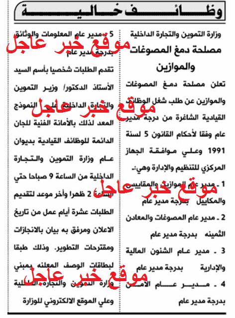 اعلان وظائف وزارة التموين مصلحة دمغ المصوغات والموازين جميع المؤهلات والمحافظات معلومة Ten