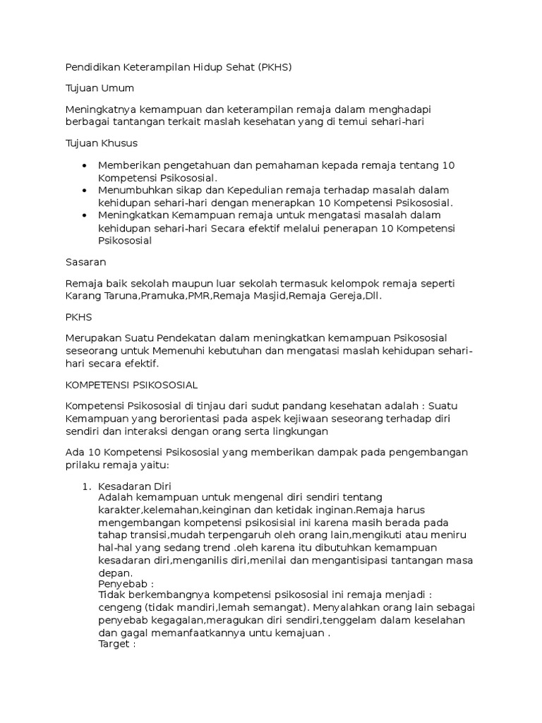 Contoh aplikasi keterampilan ini dalam kehidupan sehari hari adalah cara menolak ajakan atau tekanan teman sebaya untuk melakukan perbuatan. Pendidikan keterampilan hidup sehat pkhs adalah suatu cara belajar yang berorientasi pada keterampilan selain materi pengetahuan sehingga seseorang dapat mengimplementasikan pengetahuannya menjadi suatu. Dalam menangani kesehatan remaja perlu tetap diingat dengan optimisme bahwa bila remaja dibekali dengan keterampilan hidup sehat maka remaja akan sanggup menangkal pengaruh yang merugikan bagi kesehatannya.