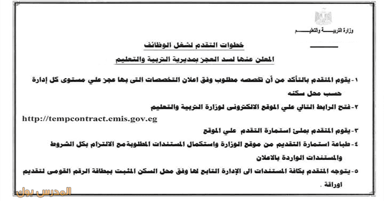 رابط التسجيل فى مسابقة التربية والتعليم 2019 والتخصصات المطلوبة قدم من هنا Tempcontract Emis